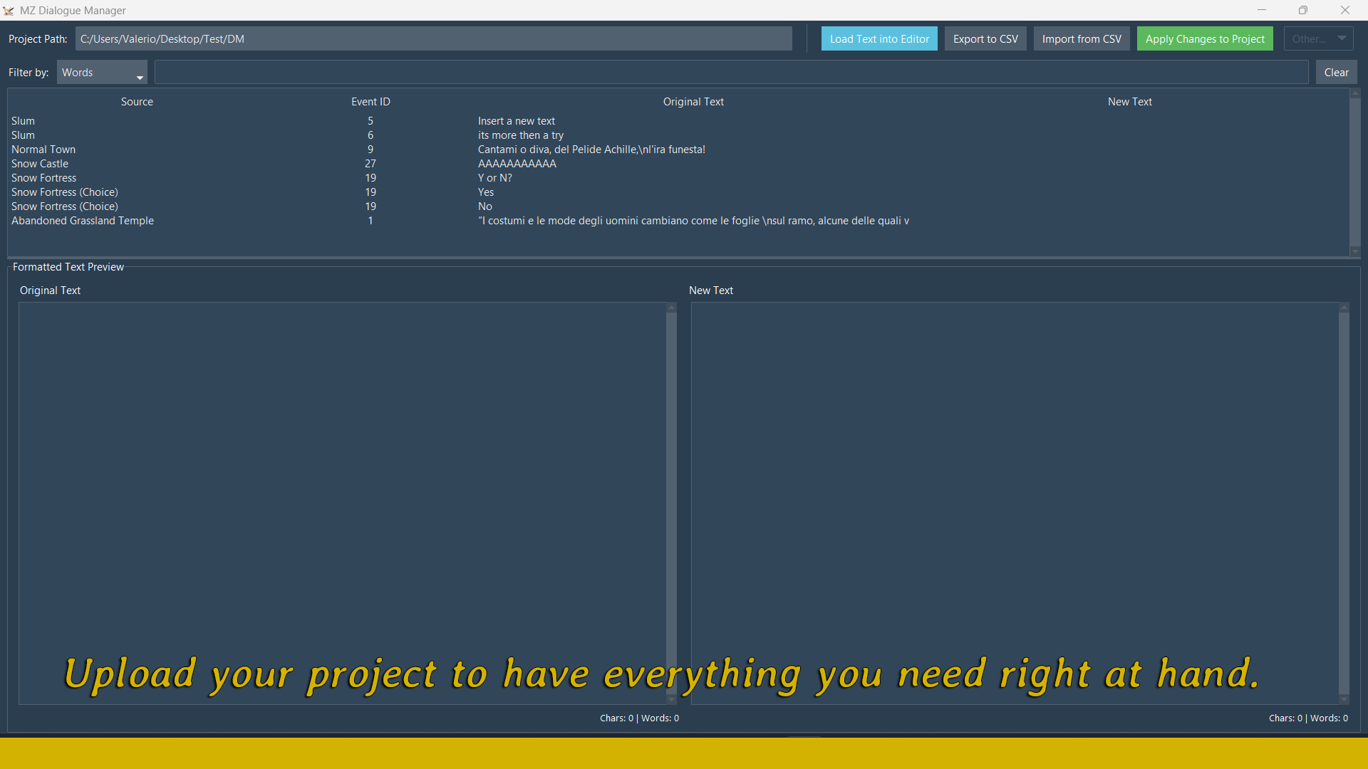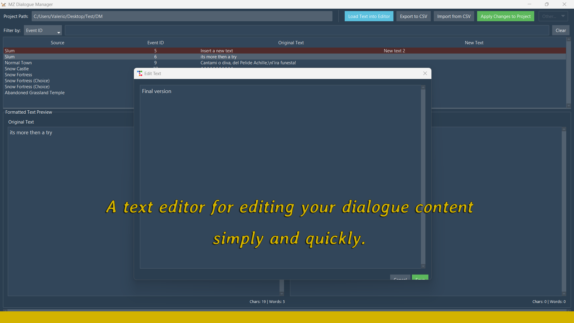 You're spot on – right now, the tool is designed mostly for editing dialogue that's already in an existing RPG Maker project. It works by scanning your project files, finding all the "Show Text" and "Show Choices" commands you've already placed, and then gathering them all into one place. This makes it super handy for proofreading, making large-scale edits, or even translating your game without having to hunt down every single event.