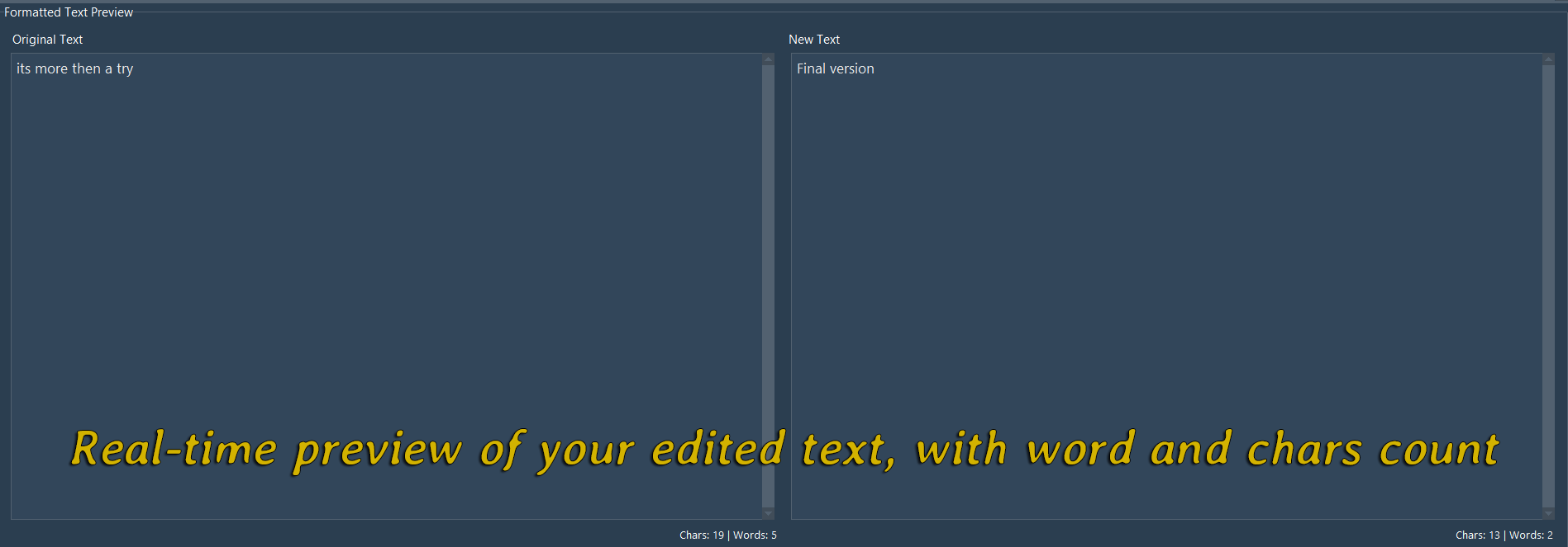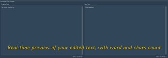 - Live Preview & Word Count: Select any row to see a clean, formatted preview of both the original and new text. Live character and word counts help you keep your dialogue concise and consistent.