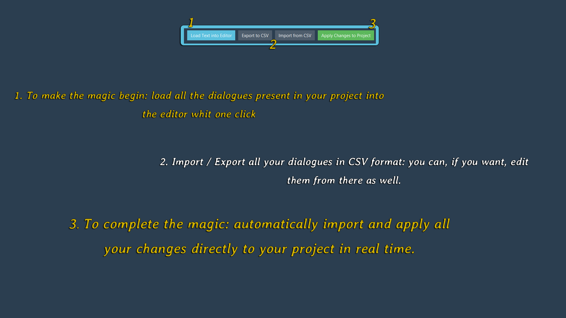 - Export: Send all your game's text to a CSV file. Open it in any spreadsheet software like Excel or Google Sheets to work with a writer or translator.